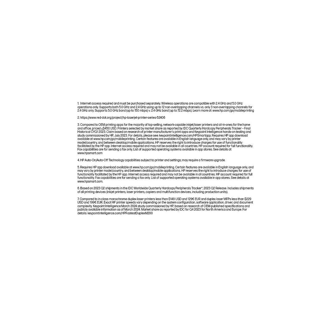 [9] Compared to in-class monochrome duplex laser printers less than £119 and duplex laser MFPs less than £179. Exact HP printer speeds vary depending on the system configuration, software application, driver, and document complexity. Keypoint Intelligence March 2024 study commissioned by HP, based on research of OEM-published specifications and publicly available information as of March 2024. Market share as reported by IDC for Q4 2023 for North America and Europe. For details: keypointintelligence.com/HPFastestDuplexM200
